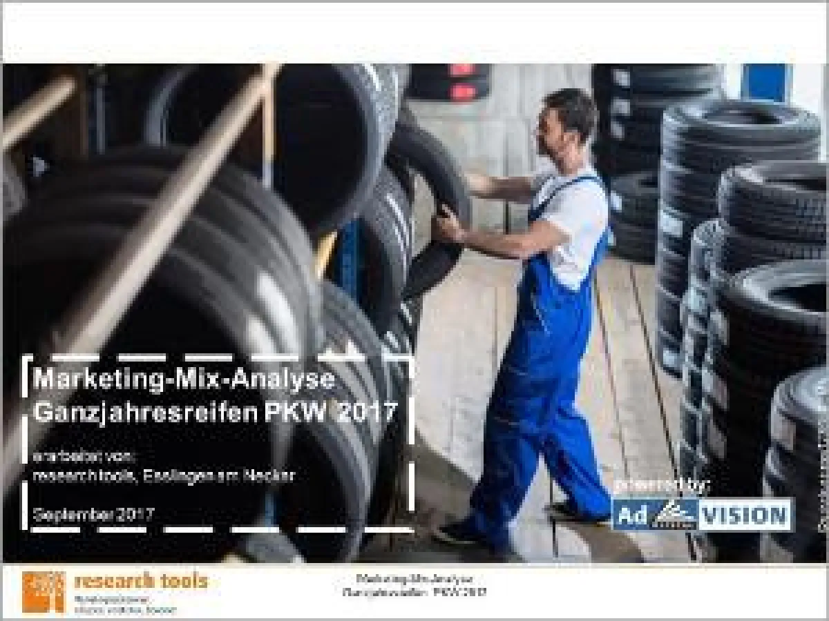 Die "Marketing-Mix-Analyse Ganzjahresreifen PKW 2017“ von research tools gibt auf 330 Seiten Einblick in das Marketingverhalten der zehn berücksichtigten Anbieter Dunlop, Fulda, Goodyear, Kleber, Matador, Maxxis, Michelin, Nokian, Pirelli, Vredestein. Analysiert wurden die vier Marketing-Ps Product, Price, Place, Promotion. Stärken-Schwächen-Analyse und Marketing-Ranking führen sämtliche Ergebnisse zusammen und eine statistische Marketing-Positionierung visualisiert die Ergebnisse.