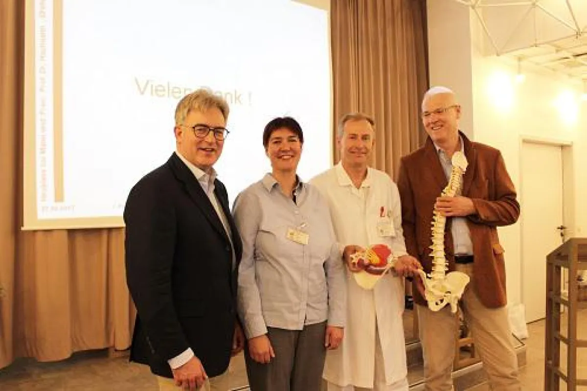 "Eine Operation kann helfen, ist aber gar nicht immer nötig", erklärte Dr. Manfred Hilscher, Direktor der Klinik für Frauenheilkunde und Geburtshilfe am Klinikum Lüdenscheid, in seinem Vortrag zum Thema "Operative und konservative Behandlungsmöglichkeiten bei Senkungs- und Inkontinenzerkrankungen". Neben den Aufgaben und der Funktion des Beckenbodens erklärte der Mediziner ganz anschaulich die Gründe für eine Beckenbodensenkung, wie sich diese äußern kann und welche Behandlungsmethoden dem Betroffenen zur Auswahl stehen. Viele Patienten die den Weg in die Klinik von Prof. Dr. Stefan Hautmann, Direktor der Klinik für Urologie am Klinikum Lüdenscheid, suchen, leiden an einer Inkontinenz in Folge eines Blasen - oder Prostatakrebses. Auch für diese Patienten hat Prof. Dr. Hautmann eine gute Lösung: die Neoblase. Aus dem körpereigenen Dünndarm wird eine neue Blase angelegt. "Das ist ein recht aufwändiger operativer Eingriff, für den viel Erfahrung nötig ist", betonte Prof. Hautmann. In weiteren Vorträgen erläuterte Physiotherapeutin Beate Müller-Rhode die Lage des Beckenbodens im Körper und wie der Beckenboden im Zusammenhang mit dem Rücken steht. Über die Möglichkeiten zur Heilmittelverordnung von Ärzten im Krankenhaus referierte Barbara Lupa in einem abschließenden Vortrag.