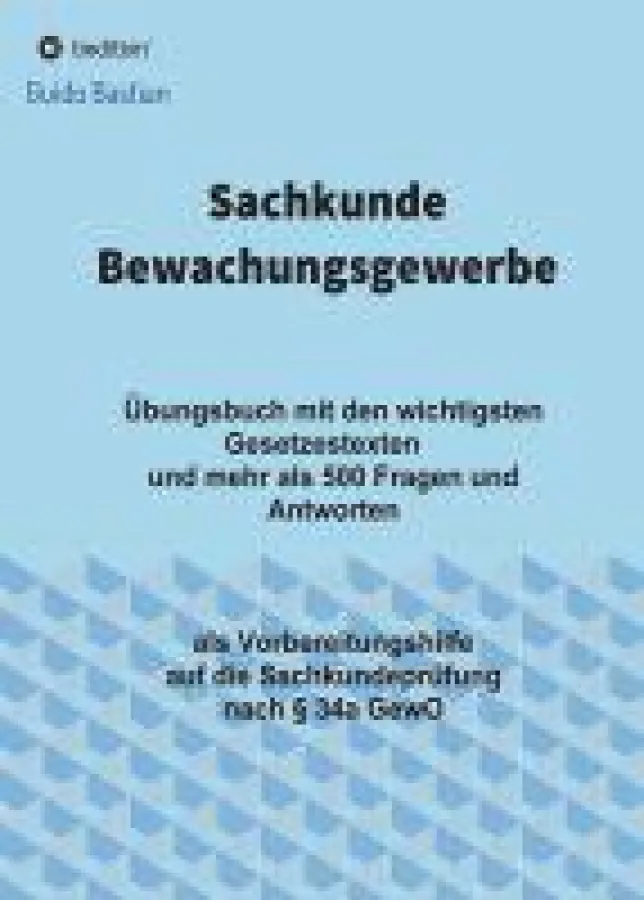 Das Buch "Sachkunde Bewachungsgewerbe" von Guido Bastian soll eine kleine Hilfestellung dazu geben, sich auf den schwierigen Teil der IHK Sachkunde Prüfung im Bewachungsgewerbe nach § 34a GewO vorzubereiten. Der Aufbau des Buches ist derartig gestaltet, dass es gut geeignet ist, ein prüfungsähnliches Üben zu ermöglichen. Teilnehmer, die ihren zukünftigen Beruf ernst nehmen und Probleme vermeiden wollen, werden zu schätzen wissen, dass die Prüfung ein wichtiger Bestandteil der Berufsvorbereitung ist und das Buch als hilfreiches Werkzeug ansehen.