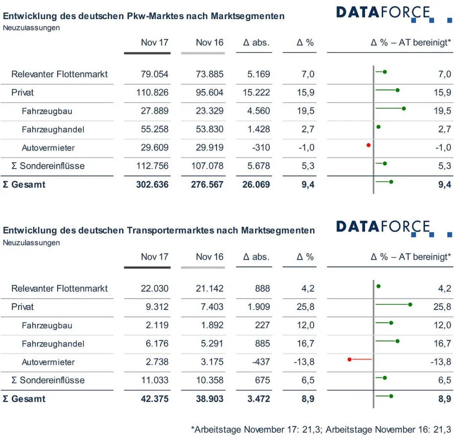 Auch für den Transportermarkt konnte Dataforce ein solides Wachstum ermitteln. Die Neuzulassungen leichter Nutzfahrzeuge und von Transportermodellen mit Pkw-Zulassung stiegen im Vergleich zum November 2016 um 8,9 Prozent. Der Privatmarkt zeichnete sich dabei durch einen Sprung um 25,8 Prozent aus, während die Neuzulassungen von Flotten „nur“ um 4,2 Prozent zulegten. Ein Neuzulassungsplus erreichten auch die Eigenzulassungen von Fahrzeugbau (+ 12,0 %) und Fahrzeughandel (+ 16,7 %), während die Anmeldungen der Autovermieter um 13,8 Prozent nachgaben.