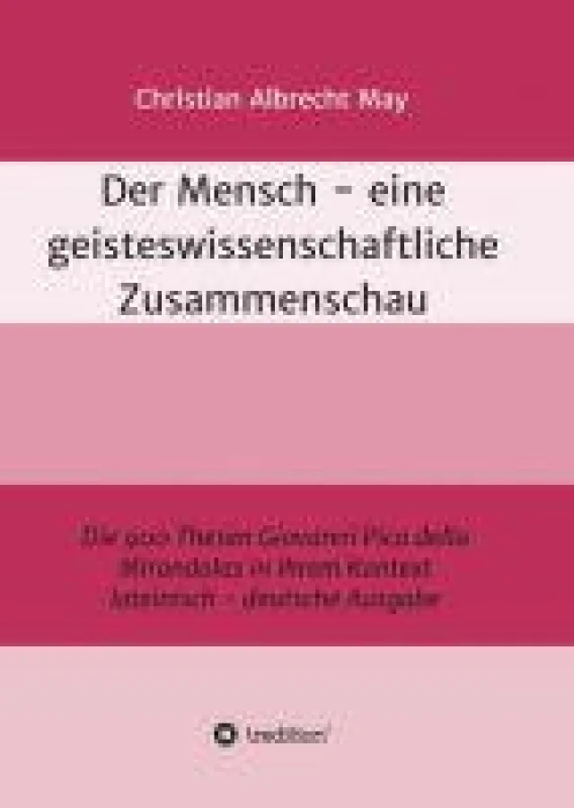 Das zweisprachige Buch (deutsch und lateinisch) "Der Mensch - eine geisteswissenschaftliche Zusammenschau" von Christian Albrecht May hilft interessierten Lesern, die Thesen von Giovanni Pico della Mirandola auf eine tiefgreifendere Weise zu verstehen. Die Ausgabe enthält neben den Thesen auch die wahrscheinlich original konzipierte Eröffnungsrede und Ausschnitte aus der umfangreichen Verteidigungsschrift, um das methodische Vorgehen dieses großen Vordenkers darzustellen und zu würdigen.
