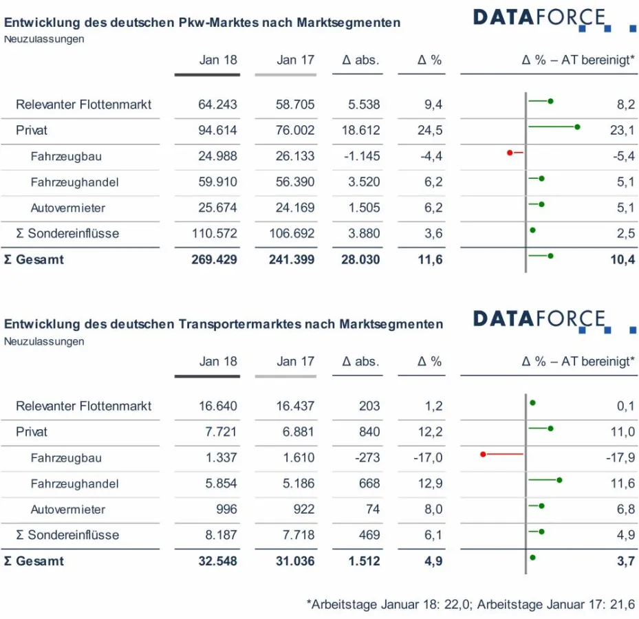 Der deutsche Pkw-Markt startete mit einem neuen Januar Bestwert in das Jahr 2018 und wuchs um 11,6 Prozent gegenüber dem Vorjahresmonat. Ein bemerkenswerter Wert, wenn man berücksichtigt, dass beide Monate fast die gleiche Anzahl an Arbeitstagen aufweisen. Nach der von Dataforce durchgeführten arbeitstäglichen Bereinigung liegt das Plus immer noch bei 10,4 Prozent.