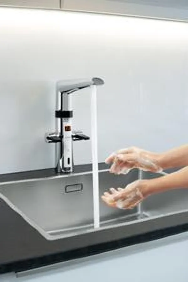 Weitere praktische Funktionen: Das Wasser wird wahlweise manuell oder berührungslos aktiviert. Eine digitale Temperaturanzeige beugt Verbrühungen vor.