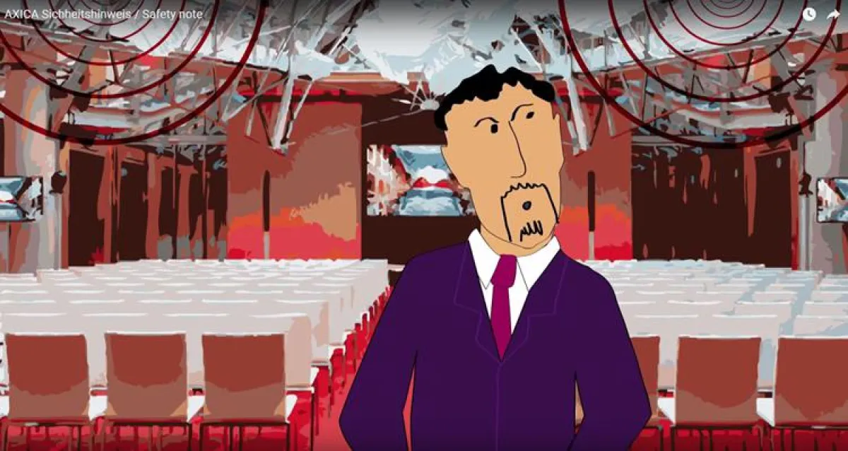 Die AXICA griff zu einem populären Mittel und ließ einen kurzen Erklärfilm erstellen. Auf unterhaltsame Weise werden die Veranstaltungsteilnehmer nun jeweils vor der Veranstaltung mit dem Verhalten im Notfall und der Lage der Notausgänge vertraut gemacht.