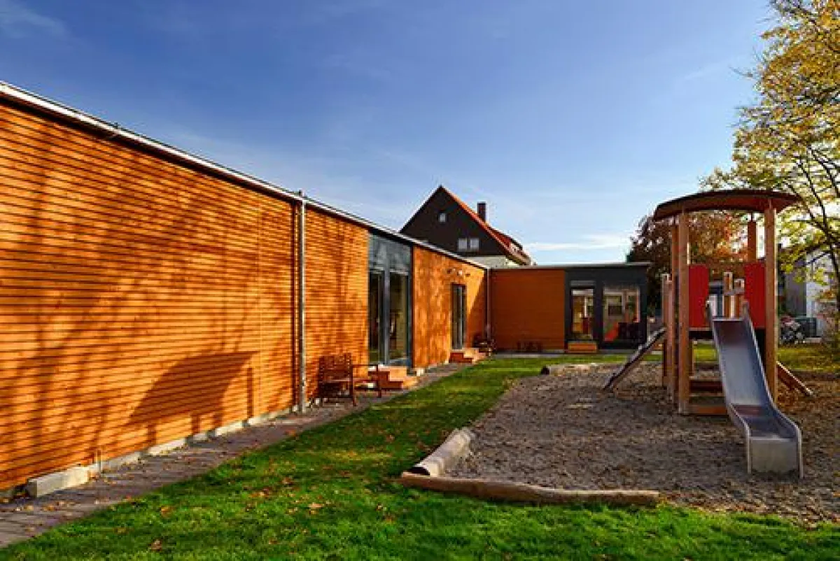 Die Kita besticht durch ihren außergewöhnlichen Grundriss aus der Feder der Gemeinde-Architektin Marion Rehberger: Der großzügige Eingangsbereich geht direkt in einen langen Spielflur über. Bauseits wurde das Gebäude mit einer Holzfassade aus sibirischer Lärche und einer Vordachkonstruktion erweitert. Das macht das Gebäude zum richtigen Hingucker – den Interimscharakter sieht man der Kita nicht an.