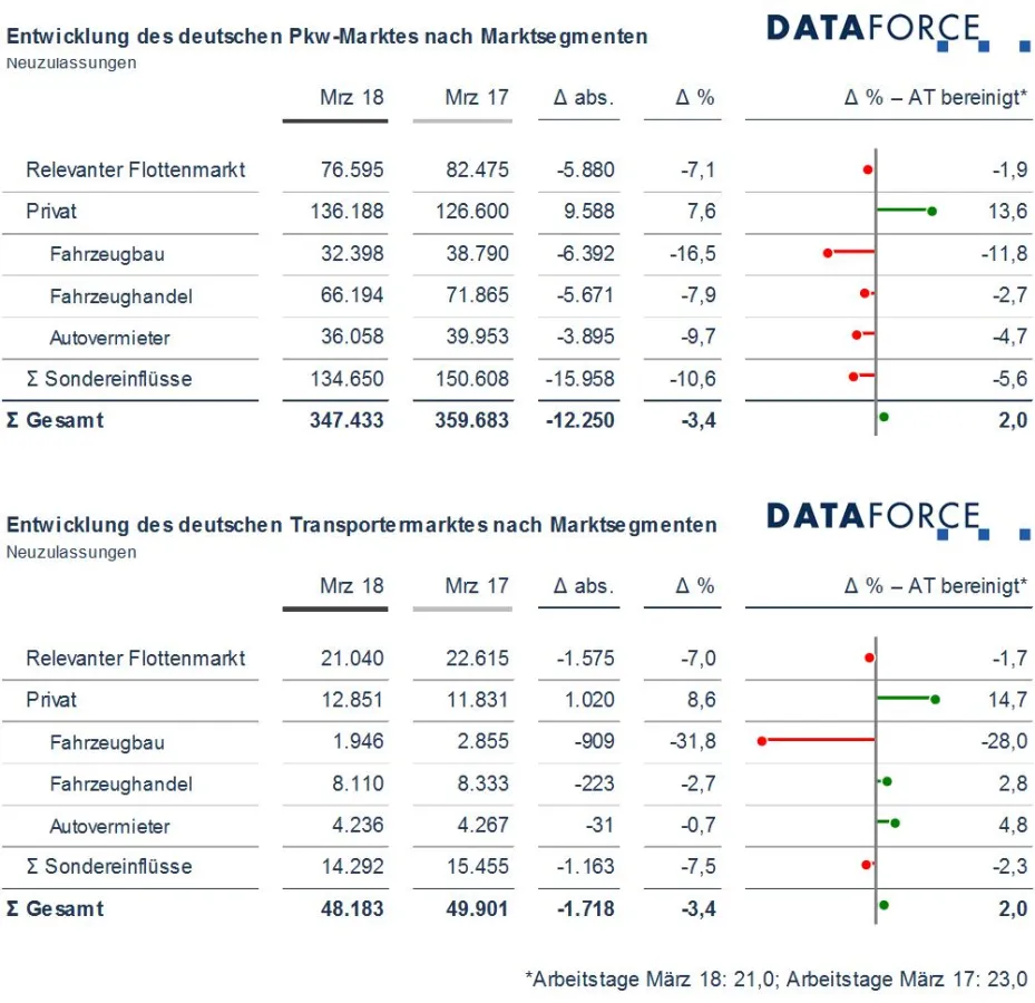 Bei zwei Arbeitstagen weniger und Osterferien, die schon in der letzten Märzwoche anfingen, musste der deutsche Pkw Markt im März ein Minus von 3,4 Prozent bei den Neuzulassungen hinnehmen. Schon die Bereinigung um Arbeitstage ergibt ein Plus von 2 Prozent und wahrscheinlich werden die früheren Ferien zu einem besseren Aprilergebnis als 2017 führen.