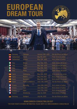 … Persönlichkeitsentwicklung startet die European Dream Tour 2025 von Dr. Martin Emrich. Den Auftakt bildet am 16. Februar 2025 ein exklusiver Workshop am Flughafen Stuttgart. Teilnehmer:innen haben die einmalige Gelegenheit, das von Dr. Emrich entwickelte „DREAM“-Modell hautnah zu erleben und direkt für ihre persönliche und berufliche Entwicklung anzuwenden.DREAM – Die fünf Prinzipien für ein erfolgreiches LebenDas „DREAM“-Modell steht für fünf essenzielle Strategien, die Menschen dabei helfen, ihre Ziele zu erreichen und ein erfülltes Leben zu führen. …