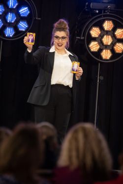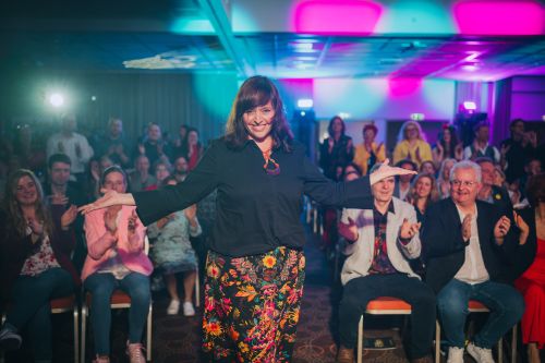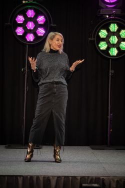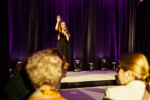 Bewusstsein auf der Bühne: Spirituelle Lehrerin und Unternehmerin strahlt im Licht der Scheinwerfer